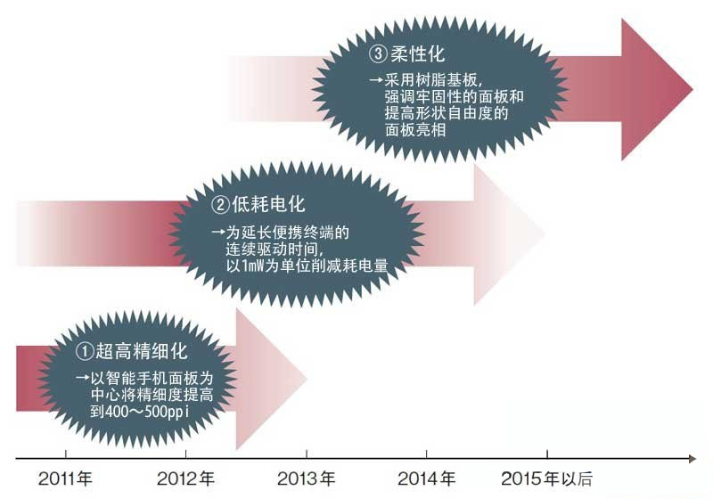 ①超高精度化的目標是,能在智能手機面板上顯示1920×1080像素的全高清影像。為此,需要將分辨率由目前的330ppi提高至400~500ppi。②低耗電量化方面,為延長便攜終端的連續(xù)驅(qū)動時間,需要以1mW為單位不斷削減耗電量。③柔性化方面,為實現(xiàn)具有高堅固性和高形狀自由度的面板,需要采用樹脂基板。