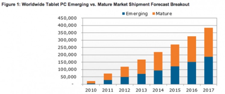 雖然那些數(shù)據(jù)本身就已十分驚人,但更令人關注的是,大多數(shù)新增的銷量將主要來自新興市場。預計到2017年,新興市場上平板電腦的銷量所占份額將由2011年的36%上升到到46%。
