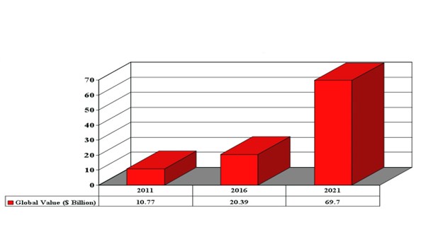 報告預測,到2021年,高亮度LED的全球消費量有望達到697億美元。這個數據是指一個特定的日歷年度的消費量,而不是累積數據。