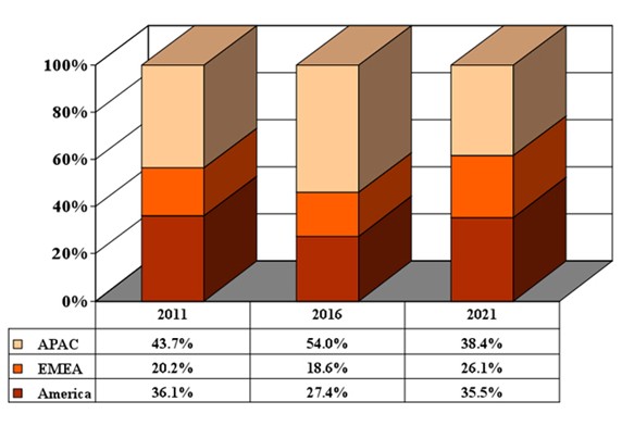 高亮度LED在美洲地區—包括南美、中美和北美—的消費量預計將從2011年的38.8億美元增至2021年的247.3億美元。2011年,歐洲、中東和非洲(EMEA)地區的高亮度LED消費量占全球市場的20.2%,隨著該地區2016年到2021年增長步伐大大加快,其市場份額也將上升。