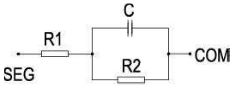 液晶顯示屏是由具有透明電極的ITO玻璃和液晶、偏振片等材料組成的。從電路的角度來(lái)講,LCD上ITO走線(xiàn)電阻的大小對(duì)顯示對(duì)比度有很大的影響。LCD的一個(gè)近似等效電路如圖4所示。其中R1表示從LCD電極到LCD像素點(diǎn)的ITO電阻;R2表示LCD像素點(diǎn)的等效直流電阻;C表示該像素點(diǎn)的等效電容。
