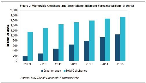 IHS公司的資深首席分析師Steve Mather 認(rèn)為,2015年全球手機(jī)銷量將達(dá)17億部,其中10億部將是智能手機(jī)。這意味著2015年超過70億的人口中,14%將購買智能手機(jī),如圖3所示。這個(gè)規(guī)模十分驚人,全球科技供應(yīng)鏈紛紛調(diào)整方向,脫離電腦產(chǎn)業(yè),投身于智能手機(jī)市場。時(shí)間框架:三年。