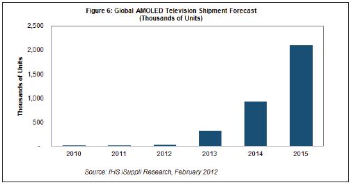據IHS iSuppli公司的中小顯示器研究報告,2015年全球AMOLED電視出貨量預計將達到210萬臺,而2012年只有3.4萬臺。雖然增幅巨大,但到2015年AMOLED電視在全球平板電視市場中的份額仍然將只有1%。