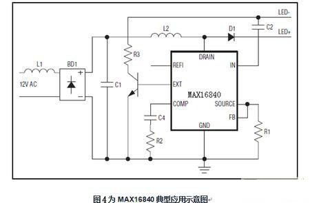 MAX16840具有的應(yīng)用特征是LED換代燈構(gòu)建技術(shù)的保證。MAX16840 集成MOSFET LED驅(qū)動(dòng)器,可用于MR16及其它12V交流輸入燈。它采用獨(dú)特的技術(shù)控制燈管的輸入電流,對(duì)輸入電流進(jìn)行整形,可使用大多數(shù)電子變壓器和調(diào)光器支持無(wú)閃爍工作,很好地解決了上述“問(wèn)題的提出”之困擾。