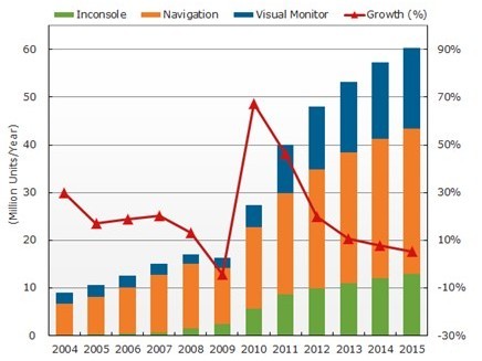 有鑒于使用在車上的電子產品日益增多,車用屏幕需具備多重功能--提供安全指示、動力信息、行車娛樂、以及其他行車所需信息。汽車導航器則因為能使駕駛員專注于道路行進,避開塞車和事故路段節省車程及時間,在全球的普及率也逐漸提高。