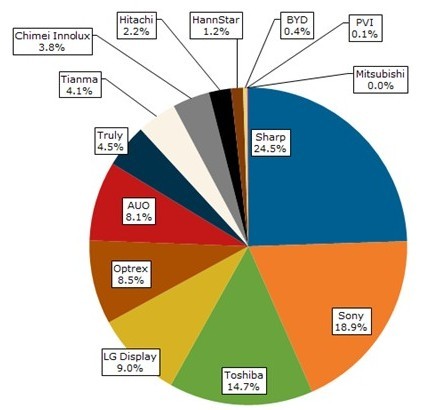 夏普、索尼、東芝等日本液晶顯示器制造商都專注于發展車用液晶顯示屏,不僅因為這些公司有能力產出高質量的中小尺寸面板,也可以取得較高獲利空間。在車載應用上,夏普為領先廠商,擁有24.5%的市占率;索尼居次,為18.9%;東芝則有14.7%的市占率。