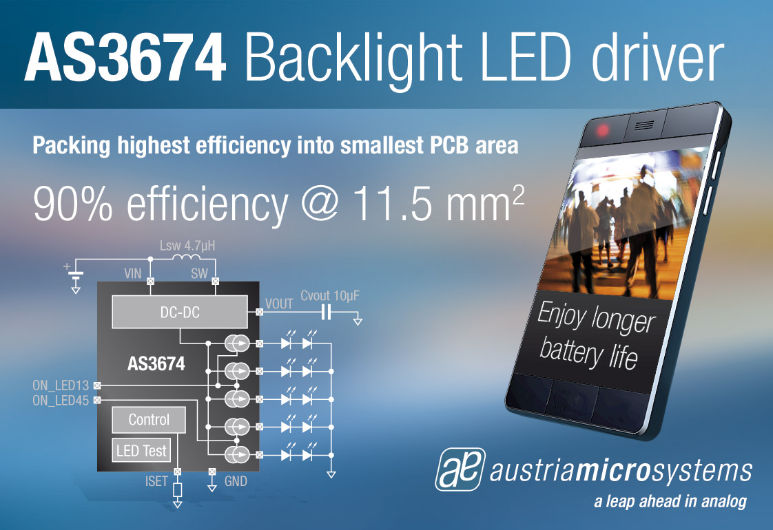 全球領先的高性能模擬IC設計者及制造商奧地利微電子公司(SIX股票代碼:AMS)宣布推出應用于智能手機LCD顯示屏的AS3674及AS3490兩款LED背光燈驅動器芯片。新品具有業內最高效能,峰值可達90%,包括DC-DC轉換器和電流源。PCB封裝僅為11.5 mm2 ,并只需4個外接組件。AS3674及AS3490非常適合應用于智能手機和其他將空間列為首要需求的移動設備。