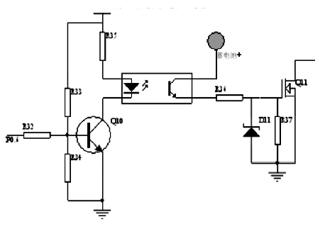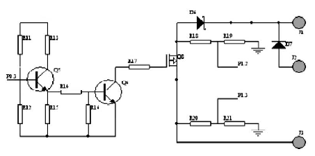 為了在夜間不同時刻采用不同的亮度,以達到節(jié)約電能的目的,本系統(tǒng)設(shè)計了兩路負載輸出,晚上12點以前兩盞LED皆亮,12點后一盞點亮,每路輸出均有立的控制和檢測。設(shè)計采用了PWM功率控制功能對LED燈具實現(xiàn)無級調(diào)光。單路原理如圖3所示。其中單片機P0.6 口給出控制信號, 即P 0 . 6 = 1 時, 三極管導通,繼電器閉合,MOS管導通,蓄電池向路燈供電。在電量不足或白天時,控制端輸出低電平信號,切斷供電回路。夜晚蓄電池電量不足情況下由市電供電系統(tǒng)給LED路燈供電,保證系統(tǒng)的完整和可靠。