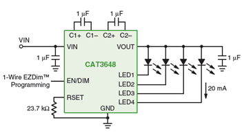 在電感升壓型拓撲結構方面,安森美半導體提供采用PWM和/或單線式調光方式的不同產品,適合在低電壓便攜式設備背光和閃光應用中驅動白光LED。這些產品包括:輸出電流為20 mA的CAT37、CAT32、CAT4238、CAT4252、CAT4253、CAT4157、CAT4158和CAT4258,輸出電流為40 mA的CAT4137和NCP5005,輸出電流為50 mA的CAT4139,以及更大輸出電流的CAT4240(250 mA)、NCP1422(800 mA)和CAT4131(1.5 A/0.3 A)等。