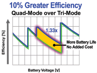 大多數電荷泵LED驅動器可提供對應于輸出電壓與輸入電壓比的三種操作模式:1倍、1.5倍和2倍;而四模架構增加了1.33倍的第四種操作模式,不需要額外的電容和電感。它比三模式電荷泵效率提高了10%以上。