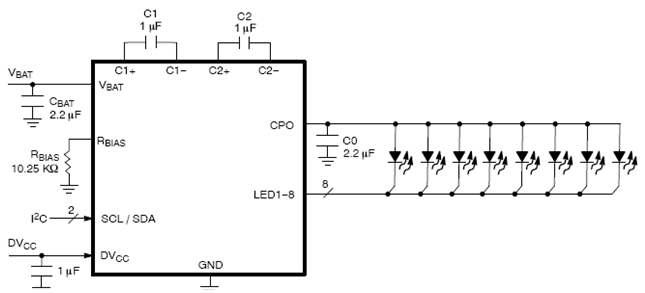 以多通道LED驅動器NCP1840為例,該器件能夠幫助用戶創建任何照明圖形,獨立驅動多達8顆LED。由于處理器不再需要直接控制各個獨立LED,采用NCP1840可簡化通常由其系統設計中處理器來完成的工作;通過統一控制各個LED亮度及閃爍率的串行接口寫入寄存器或讀取寄存器,能夠方便地進行電流及調光程度編程。LED亮度程度能以對數而非線性形式控制,從而使肉眼觀看也沒有亮度失真。NCP1840采用高能效、低噪聲四模電荷泵,能夠延長電池使用時間,非常適合便攜式應用。