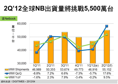 2012年第1季全球NB出貨淡季不淡,所反映的全產業復蘇跡象,DIGITIMES Research資深分析師兼主任簡佩萍預估,將延續至第2季,并展現更強勁的反彈,季成長幅度將達17.6%,年成長率也將達近2年高點,為9.5%,單季出貨量則預估可挑戰5,500萬臺新高。