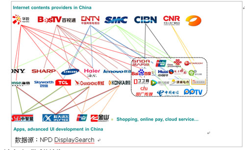 回顧過去近10年平板電視技術的發展趨勢,初期的5年左右,電視產品技術發展的重點幾乎都是面板技術,然后慢慢過渡到面板技術和電視其他硬件規格,現在和未來的重點則更多轉向電視本身規格、內容和服務?;诔浞值母偁?,中國電視產品技術演進的速度甚至快于歐美和日本市場。以下圖表為主要品牌廠商在智能電視內容和應用發展的關系圖。