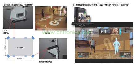 (a)是Renaissance經營的健身俱樂部設置的“e運動場”。使用投影儀把游戲畫面投影投影到訓練館中,用戶親身參與其中。人體動作使用距離圖像傳感器獲取。照片上是2位運動員相對而立,向對方球門射出虛擬球的“空氣曲棍球”游戲。(b)是耐克公司與微軟公司合作為“Xbox 330”開發,支持Kinect的健身軟件“Nike+Kinect Training”的畫面示例。該軟件將檢測身體的動作,為目標提供有效訓練方式。