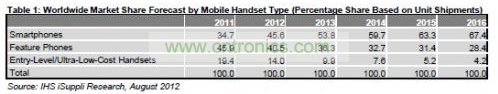 今年智能手機出貨與與市場份額強勁擴張,將首次成為領先的手機類型,而且未來幾年出貨量將保持兩位數的增長速度。到2016年,智能手機將占總體手機市場的67.4%,如表1所示。