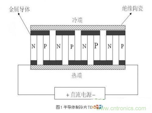 半導體制冷又稱電子制冷,或者溫差電制冷,是從50年代發展起來的一門介于制冷技術和半導體技術邊緣的學科,與壓縮式制冷和吸收式制冷并稱為世界三大制冷方式。半導體制冷器的基本器件是熱電偶對,即把一只N型半導體和一只P型半導體連接成熱電偶(如圖1),通上直流電后,在接口處就會產生溫差和熱量的轉移。在電路上串聯起若干對半導體熱電偶對,而傳熱方面是并聯的,這樣就構成了一個常見的制冷熱電堆。借助于熱交換器等各種傳熱手段,是熱電堆的熱端不斷散熱并且保持一定的溫度,而把熱電堆的冷端放到工作環境中去吸熱降溫,這就是半導體制冷的原理。