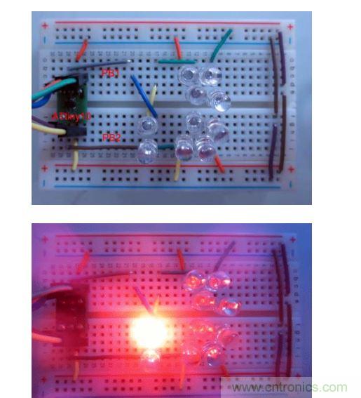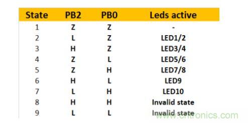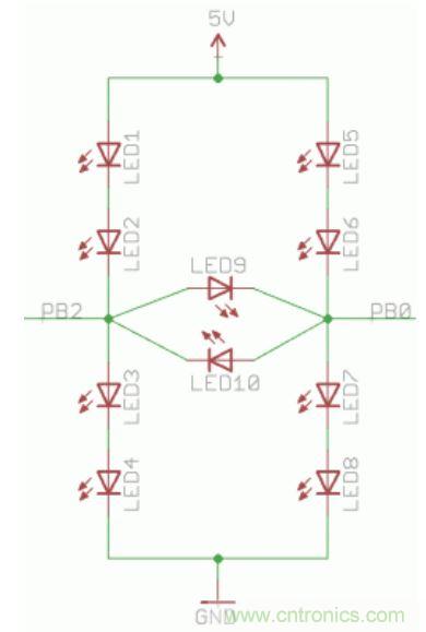 當(dāng)PB0和PB2中有一個引腳處于高電平或低電平狀態(tài),而另一個引腳為高阻抗?fàn)顟B(tài)時,那就會有一對LED會發(fā)光。而當(dāng)PB0為高電平而PB2為低電平或恰好相反時,LED9或LED10就將和一對LED并聯(lián)。這時大部分的電流會流過單個LED,所以這時只有LED9或LED10會發(fā)光。