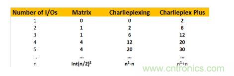 我們可以講這種新的方案成為“查理復(fù)用+(Charlieplex Plus)”。分析表明,依靠這樣的技術(shù),一個I/O口可以比普通的查理復(fù)用技術(shù)多控制兩個LED。也就是說n個I/O口所能控制的LED數(shù)量就為2n+n²-n = n²+n。具體情況如上表所示。