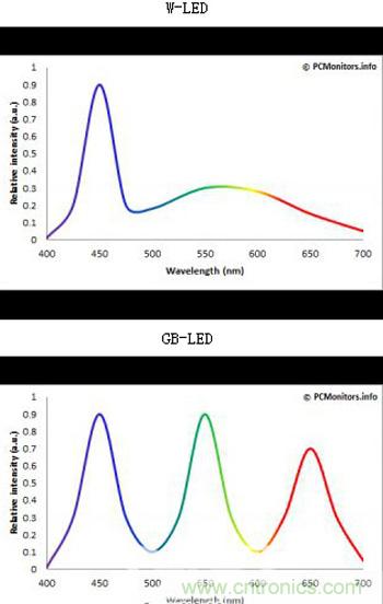 不管是投影儀還是電視機都采用的是RGB-LED光源,也就是紅黃藍三色LED光源,而這3種顏色的LED,以“藍光LED”最為重要,減弱藍光則會使色彩失真,整體畫面色調偏紅黃。一起看看LED顯示器兩種主要發光模塊W-LED(常用)和GB-LED的光譜組成。如下圖: