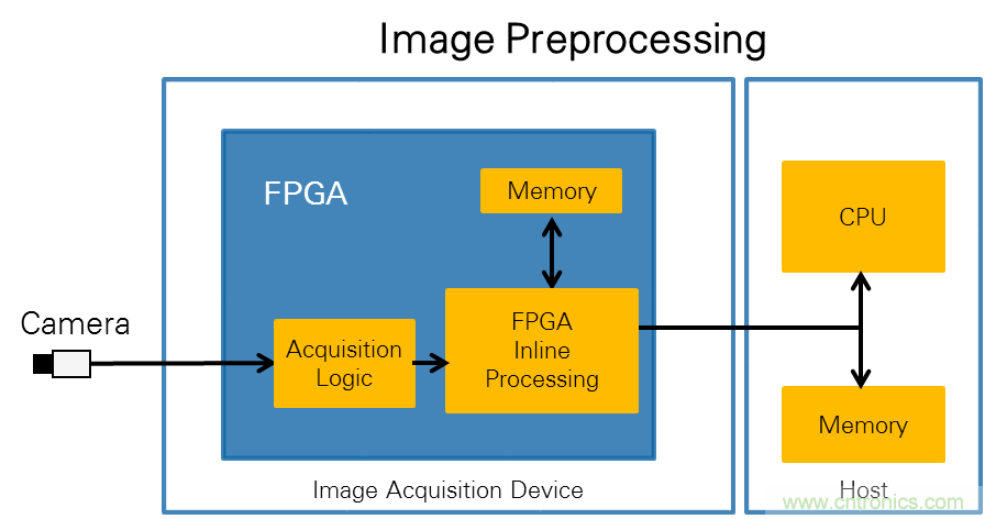 圖2.在嵌入式FPGA處理架構中,您可以將相機接口直接連接到FPGA的引腳,以便像素可直接從相機發送到FPGA。