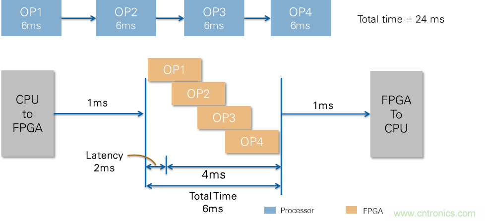 CPU按順序執行操作,因此第一個操作必須在整個圖像上運行結束后,第二個操作才能啟動。在本例中,假設算法中的每個步驟在CPU上運行需要6ms;因此,總處理時間是24毫秒?,F在考慮在FPGA上運行相同的算法。由于FPGA本質上是大規模并行的,所以該算法中的四個操作可以同時對圖像中的不同像素上操作。這意味著接收第一個處理的像素僅需2ms的時間,處理整個圖像需要4ms的時間,因而總處理時間為6ms。這比CPU的執行速度快得多。即使使用FPGA協處理架構并將圖像傳輸到CPU,整個處理時間(包括傳輸時間)也比單獨使用CPU要短得多。