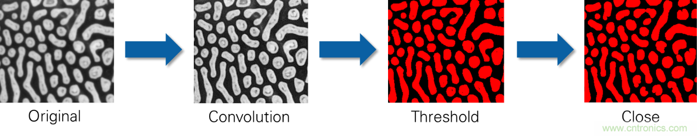 現在考慮一個真實的例子,比如粒子計數所需的圖像。首先需要應用卷積濾鏡來銳化圖像。接下來,通過閾值運行圖像以生成二進制圖像。這不僅可以通過將其從8位單色轉換為二進制來減少圖像中的數據量,還可以為二進制形態學應用準備圖像。最后一步是使用形態學來應用關閉功能。這會去除二進制粒子中的任何孔。
