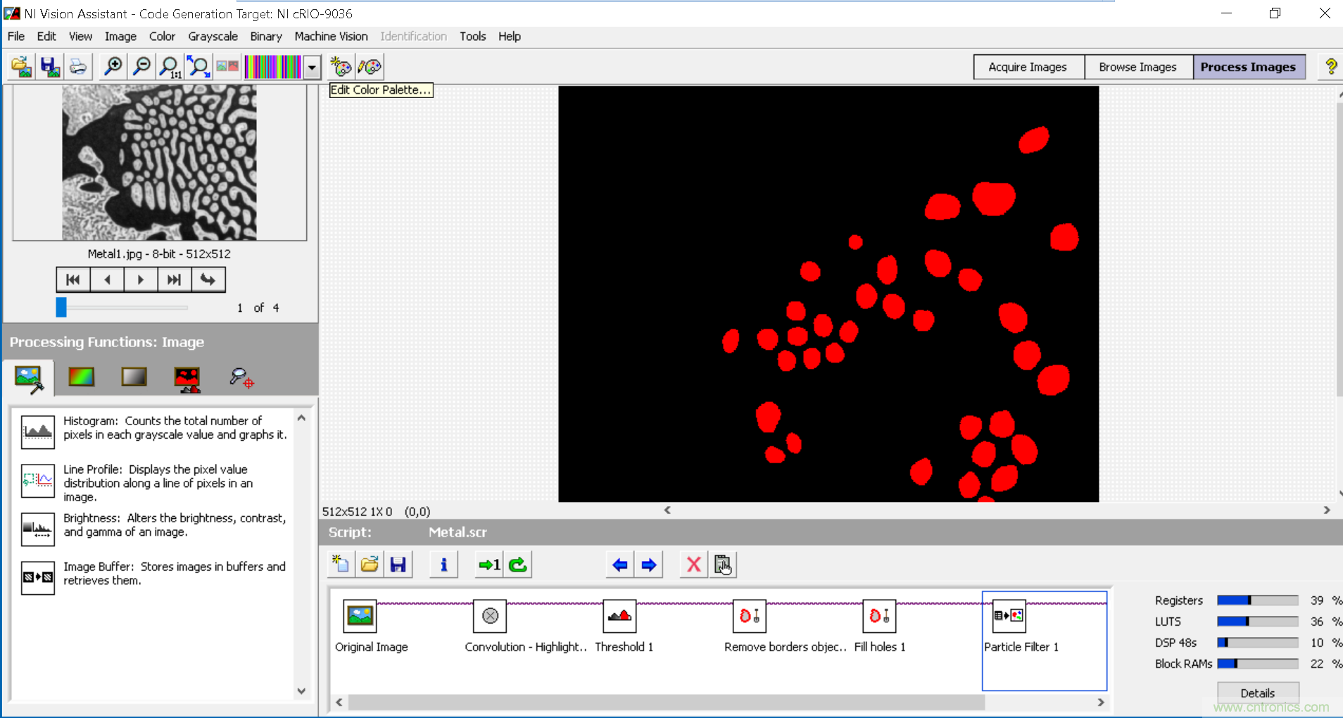 為了實現生產率的最大化,不論使用哪種處理平臺,都需要立即獲得關于算法的反饋和基準測試信息。當使用迭代探索性方法時,實時查看算法結果將會節省大量時間。什么是正確的閾值?用二進制形態濾波器剔除的顆粒多大或多???哪種圖像預處理算法和算法參數可以最好地清理圖像?這些都是開發視覺算法時的常見問題,而關鍵在于是否能夠更改并快速查看結果。然而,傳統的FPGA開發方法可能會減緩創新,因為算法的每個設計變化之間需要編譯時間??朔@一點的一個方法是使用一個算法開發工具,可讓您在同一個環境進行CPU和FPGA的開發工作,而不會在FPGA編譯時陷入困境。NI Vision Assistant是一種算法工程工具,用于開發部署到CPU或FPGA上的算法,以幫助您簡化視覺系統設計。您還可以使用Vision Assistant在目標硬件上編譯和運行之前測試算法,同時輕松訪問吞吐量和資源利用率信息。