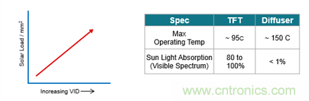 為了更好地理解為什么散射屏具有優(yōu)勢,我們不妨來看看散射屏與傳統(tǒng)TFT面板的物理特性(圖4)。散射屏具有的兩大主要優(yōu)勢在于可在更高的溫度中工作,此外散射屏不會吸收大量的太陽入射可見光譜,這一點更加重要。(光譜的紅外[IR]和紫外[UV]部分很容易被過濾。)