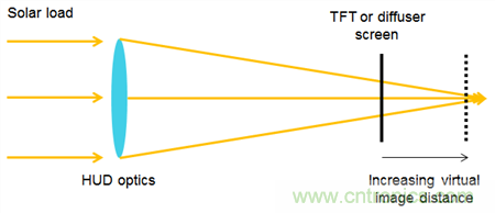 圖 2:HUD光學器件將太陽能負載放大到散射屏或薄膜晶體管(TFT)面板上