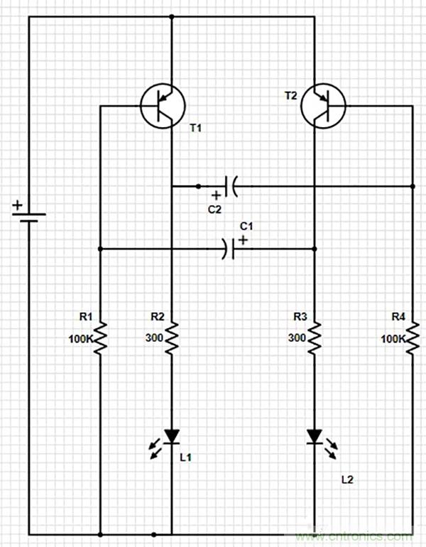 【導讀】簡易閃爍/閃動LED電路是一個最常見的電子起步項目。以下是我使用Scheme-it工具構建的簡易電路圖。(據(jù)估算需使用9VDC電源或電池供電。)