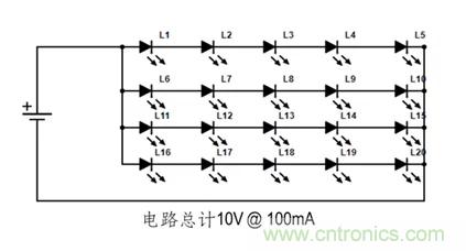 一般說來, 大多數LED照明都使用串并聯組合。如下圖:
