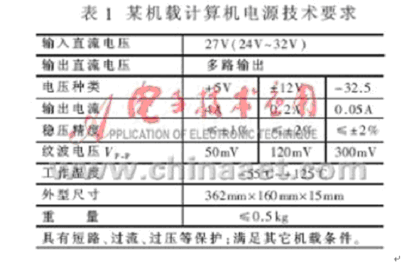 小體積、輕重量、高可靠性、高效率是航空電源始終追求的目標。隨著微電子技術的發展,采用大規模和超大規模集成電路的機載計算機主機已越來越小型化,這就對其電源部件的體積和重量提出了進一步小型化的要求。機載計算機是一種抗惡劣環境的計算機,其電源部件也必須滿足抗惡劣環境的要求,例如必須適應-55℃~+125℃的環境溫度和較寬范圍的輸入電壓;同時還要耐振動、耐撞擊、抗電磁干擾等。