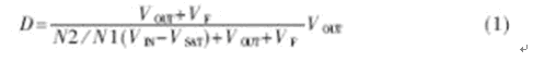 其基本工作原理為:當開關管Q1導通時(TON),電流流過變壓器T1的初級線圈N1,變壓器將能量以磁場的形式儲存起來,由于初、次級圈相位不同,所以當電流流過初級線圈時,次級線圈N2中沒有電流流過。當Q1截止時(TOFF),消失的磁場使初、次級線圈中電壓極性反轉,整流二極管VD導通,電流通過VD流向負載,變壓器的能量釋放,提供負載電壓、電流??刂破髡伎毡葹?
