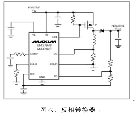 也可以選擇負電壓輸出轉換器, 圖六便是常用的PWM負壓轉換器, 外部元件少、設計簡易, 工作在固定頻率的PWM結構干擾較小。