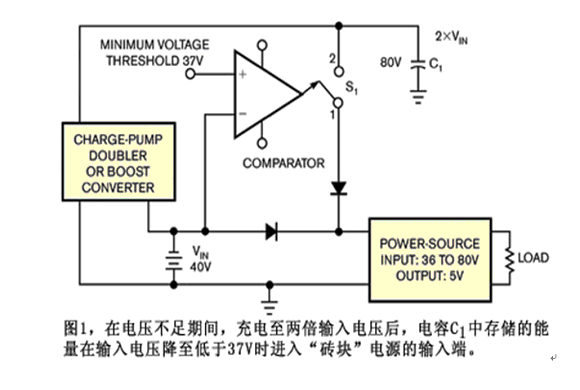 應(yīng)記住,電容存儲(chǔ)的能量以指數(shù)增加,而電容的電壓線性增加。倍增器把C1充電至兩倍輸入電壓或至少為80V。即便假定每10s出現(xiàn)一次5ms電壓不足,用于充電200mF的電流仍僅約為3mA。比較器觀察輸入電壓,并且一旦它降至低于37V,開關(guān)S1就會(huì)關(guān)閉,而來(lái)自C1的能量向“磚塊”電源放電。