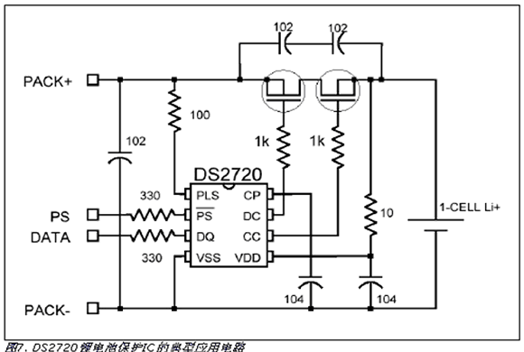 因為Li+電池過充或過放可能會導致爆炸并造成人員傷害,所以使用這類電池時,安全是主要關心的問題。因此,商用鋰離子電池組通常包括象DS2720這樣的保護電路(圖7)。