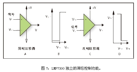 LMP7300的滯后值受控于VREF電壓和施加于HYSTP和HYSTN引腳電壓之間的電壓差。圖7A和7D顯示了兩種可能的滯后連接。如果一個滯后引腳被直接連接到VREF電壓,那部分滯環(huán)就會被刪除。參考圖6,滯后電壓值約為20mV: