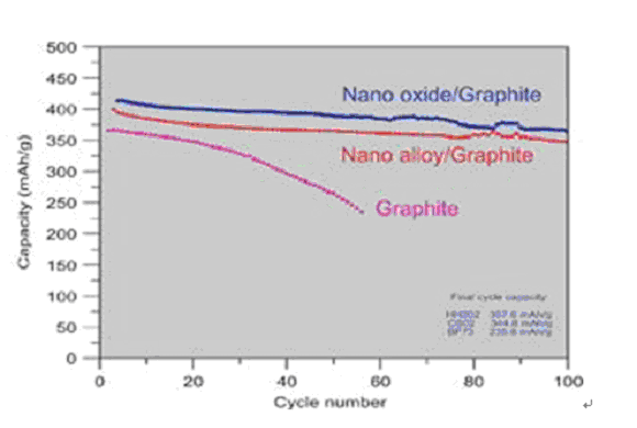 目前商品化的鋰電池負(fù)極材料,主要種類包括石墨化碳、人工石墨、硬碳及碳纖維等。其中石墨化碳(如介穩(wěn)定相碳狀碳)的市場(chǎng)佔(zhàn)有率最高約30%,其材料價(jià)格高(每公斤30~32美金)、容量適中、壽命佳,目前被大量使用于鋰電池負(fù)極材料;然而其容量已達(dá)技術(shù)極限,非得使用更高容量的石墨碳材或合金材料,才能獲得高能量密度的鋰電池。目前高容量負(fù)極材料的開發(fā),主要包括利用高能量機(jī)械合金化研磨(high-energy mechanical alloying) 技術(shù),將金屬或合金材料進(jìn)行高能量研磨,以獲得納米結(jié)構(gòu)金屬或合金材料;或?qū)⑻挤郾砻驽兩弦粚蛹{米氧化物及合金材料,以形成納米復(fù)合負(fù)極材料,如(圖三)。