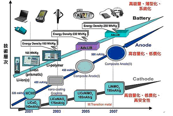 鋰二次電池雖然已廣泛使用于3C產(chǎn)品上,然而隨著筆記型電腦使用1GHz CPU而增加耗電量,以及LCD螢?zāi)怀叽缂哟蟆⒔馕龆忍岣摺⑹褂酶呷萘坑驳癉VD-ROM等趨勢(shì),未來(lái)筆記型電腦整體功率消耗明顯提高,因此對(duì)鋰電池主要的技術(shù)提升需求,包括提升電池能量密度、降低重量與智慧型電源管理。未來(lái)行動(dòng)電話從2G提升至3G時(shí),不論是GSM、WCDMA等系統(tǒng),所需要的電池能量密度都需要明顯的增加。目前薄型鋰電池系統(tǒng)的重量能量密度雖有顯著的提升,但主要是罐體外殼的輕量化,在電極材料的性能提升上,進(jìn)展較少。針對(duì)3G所強(qiáng)調(diào)的高體積能量密度>420 Wh/L要求,目前薄型鋰電池的體積能量密度(340~360 Wh/L)仍無(wú)法符合其規(guī)格目標(biāo)。未來(lái)各種多功能的手錶(Multifunctional Watch),將具有Phone、DSC、MP3等功能,此時(shí)對(duì)能量密度高且薄型化鋰電池的需求更加迫切,另一方面3G行動(dòng)電話與結(jié)合電腦、PDA、行動(dòng)電話等功能的行動(dòng)資訊與通訊終端產(chǎn)品(Mobile IA),將大量地被使用,對(duì)具有高能量密度的鋰電池同樣迫切需求,如(圖二)。因此開發(fā)高容量及高功率的納米級(jí)鋰電池材料,并應(yīng)用于新世代的納米鋰電池上,是全世界鋰電池業(yè)者目前最重要需突破的目標(biāo)。