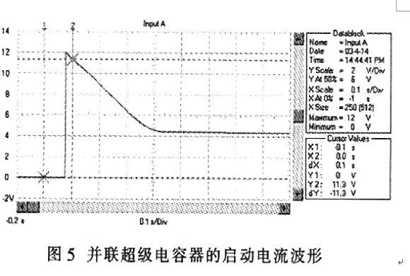 超級電容器">電容器與蓄電池并聯時,汽車啟動過程的電壓波形如圖4所示,電流波形如圖5所示。與圖1和圖2相比,啟動瞬間電壓跌落由只采用蓄電池時的3.2V提升到7.2V;啟動電流從560 A提高到l200 A;啟動瞬時的電源輸出功率從2 kW上升到8.7kW;啟動過程的平穩電壓由7 V提高到9 .4 V;啟動過程的平穩電流由280 A提高到440 A;啟動過程的電源平穩輸出功率從2.44 kW提高到4.12 kW。