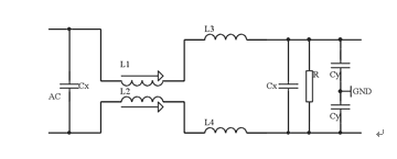 圖4是220V/50Hz交流輸入的開關電源交流側EMI濾波器的電路。Cy=3300pF,L1、L2=0.7mH,它們構成共模濾波電路,抑制0.5~30MHz的共模干擾信號。Cx=0.1μF,L3、L4=200~500μH,采用金屬粉壓磁芯,與L1/L2、Cx構成L-N端口間低通濾波器,用于抑制電源線上存在的0.15~ 0.5MHz差模干擾信號。R用于消除可能在濾波器中出現的靜電積累。