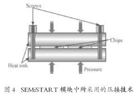 SEMiSTART模塊中,用于芯片的連接技術基于壓接技術,兩個晶閘管芯片反并聯連接并被壓在兩個散熱器之間。