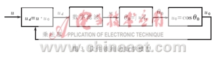 式(4)中第二項是一個倍頻的交流成分,若θ-θ0是常量,第一項則為直流成分。而且,若θ-θ0接近于-π/2,則cos(θ-θ0)=sin(θ-θ0+π/2)≈θ-θ0+π/2。故對于ud的直流成分來說,模擬相乘器相當于一個相位的減法器。