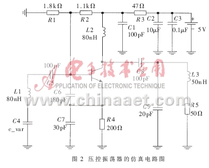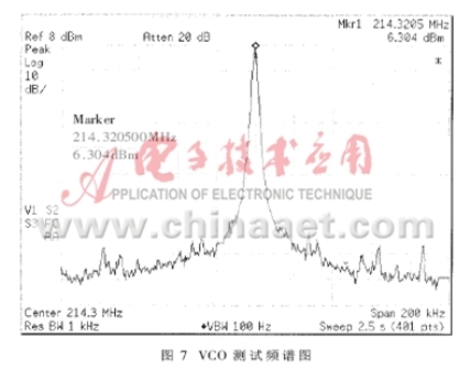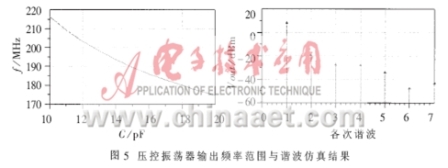 式中,fm為頻偏,KVCO為VCO控制靈敏度,fo為振蕩頻率,Q為品質因數,F為晶體管的噪聲系數,K為波爾茲曼常數,T為工作溫度,Ps為振蕩信號功率,fc為閃爍噪聲拐角頻率,Vm為低頻噪聲源的總幅度。從式(5)可以看出,選擇噪聲系數小的放大管、增加諧振回路有載Q值、減小VCO控制靈敏度、提高輸出信號功率都可以降低相位噪聲。通過減小變容管在諧振回路中的接入系數,可以有效減小VCO控制靈敏度,但是也會導致頻率覆蓋范圍的減小,所以要適當選擇接入系數。該VCO輸出頻率為200MHz時,變容管接入系數為0.63。通過適當調整輸出回路的電感和分壓電容,可以提高負載阻抗,從而有效地提高輸出功率,以達到降低相位噪聲的目的。通過軟件仿真,在頻偏10kHz處的輸出相位噪聲為-101.3dBc/Hz,在100kHz處的相位噪聲為-122.5dBc/Hz。