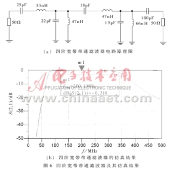 從圖5可以看出,壓控振蕩器的輸出頻率范圍為175MHz~217MHz,基波(頻率為214MHz時)輸出功率為7.911dBm,二次諧波為-16.368dBm,可見有效地抑制了諧波分量。在實際應用中,對諧波濾除的要求比較高,可以在輸出端接入寬帶濾波器,其電路原理圖和仿真結果見圖6。這樣,可以更有效地濾除高次諧波,同時有利于輸出匹配,減小負載對輸出功率的影響。
