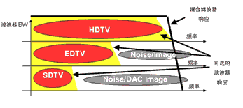 ED 480p/576p信號也可能出現這種情況。此類信號通常采樣頻率為54MHz,視頻帶寬為 12MHz。因此,第二Nyquist區圖像會在42MHz時出現。如果無源濾波器為35MHz或更高,那么圖像的衰減也會很小,同樣也會導致畫質非常差。