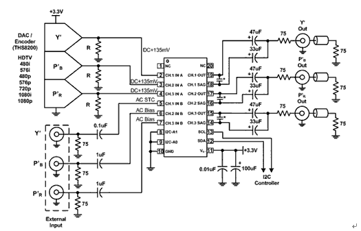 如果DAC的參考電壓為3.3V或1.8V或者是外部輸入,那么采用AC耦合就是最佳模式。AC耦合使THS73x3能忽略DC偏置點的來源,并能重新建立自己的DC偏置點。AC耦合選項包括AC偏置和AC同步端鉗位。