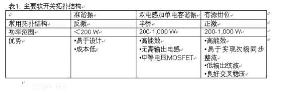 要提高主轉換器能效可以采用以下幾種方法。一是通過降低導通阻抗(開關損耗較高)和/或減小初級峰值電流和均方根電流來降低初級導通損耗;二是考慮采用軟開關技術降低開關損耗;三是通過減少整流器壓降(使用低正向壓降二極管或FET整流器)來降低次級損耗;四是采用更好的磁芯材料來降低磁芯損耗。表1列出了主要軟開關的拓撲結構,可供設計時參考。
