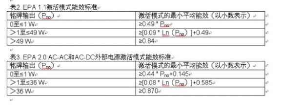 美國環保署外部電源1.1版和2.0版規范分別對激活模式能效標準,以及AC-AC和AC-DC外部電源激活模式能效標準做出了規定,如表2和表3所示。