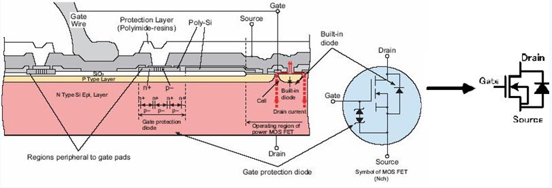 在MOS管原理圖上可以看到,漏極和源極之間有一個寄生二極管。這個叫體二極管,在驅動感性負載(如馬達),這個二極管很重要。順便說一句,體二極管只在單個的MOS管中存在,在集成電路芯片內部通常是沒有的。下圖是MOS管的構造圖,通常的原理圖中都畫成右圖所示的樣子。 (柵極保護用二極管有時不畫)
